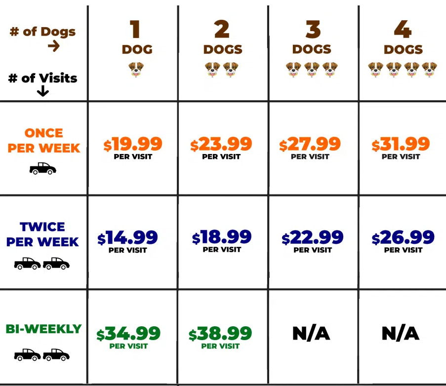 Le prix dépend de la taille du jardin, de la fréquence et du nombre de chiens. Contactez-nous pour un devis gratuit !
